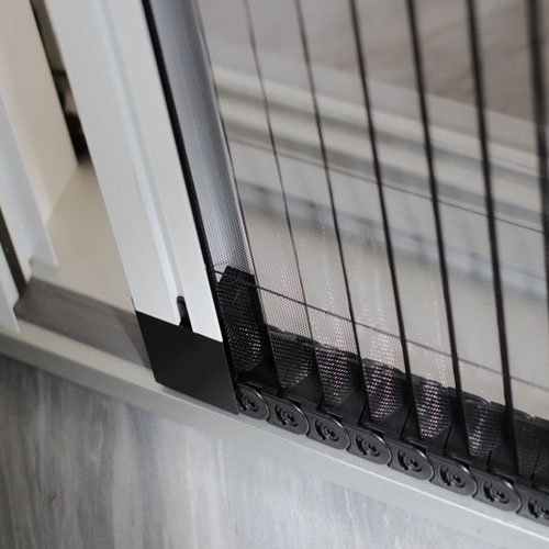 Σήτα με πλισέ πανί και ερπύστρια για ελεύθερη διέλευση αφού δεν υπάρχει κάτω οδηγός προσφέροντας παράλληλα και ευκολότερο καθαρισμό δαπέδου